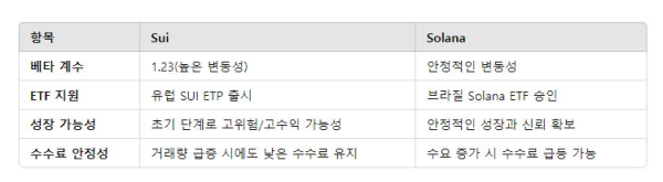 투자자들이 장기적인 안정성을 중시할 경우 솔라나가 유리한 선택이 될 수 있다. 반면, 빠른 수익과 고위험을 감수할 준비가 되어 있는 투자자라면 수이에 관심을 가질 만하다.