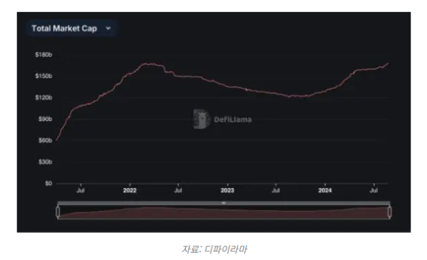 디파이라마 데이터에 따르면 이번 수치는 2022년 3월 기록한 1670억 달러의 이전 최고치를 넘어섰다. 당시 기록 이후 시장은 급락해 연말까지 1350억 달러로 줄어들었다.