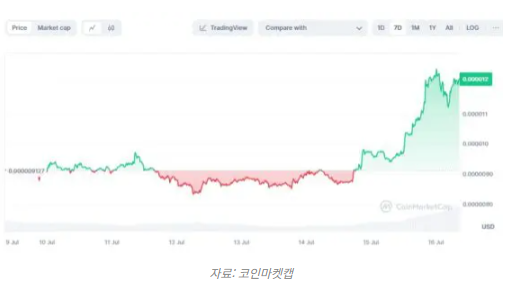 [뉴욕=박재형 특파원] 암호화폐 시장이 전반적인 반등을 하는 동안 인기 밈코인 페페(PEPE)의 상승세가 두드러진다.