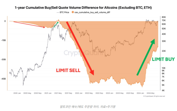이 지표는 1년 동안의 매수와 매도 지정가 주문 간의 차이를 측정한다. 고래들은 슬리피지를 피하기 위해 지정가 주문을 선호한다는데 착안했다.