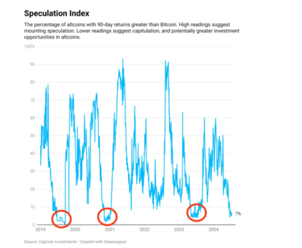 이러한 현상은 암호화폐 시장에서도 관찰된다. 2019년 상반기, 2020년 말, 2023년 하반기에 목격됐던 것처럼 투기 지수의 10% 이하 하락은 2019년 이후 비트코인의 급격한 상승 시작과 일치했다.