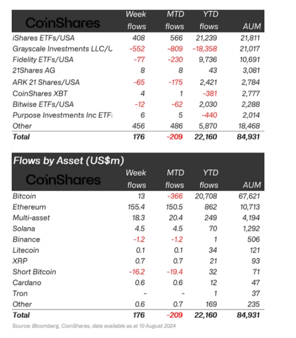 12일(현지 시간) 코인셰어스 주간 보고서에 따르면 8월 10일 기준으로 이전 한 주 동안 전체 디지털 자산 펀드에 1억7600만 달러가 유입됐다. 직전주에는 5억 달러 넘는 자금 유출을 경험했다.