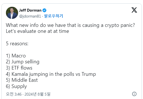 [블록미디어 이제인 기자]투자회사 아카(ARCA)의 최고정보책임자(CIO) 제프 도만(Jeff Dorman)이 암호화폐 시장에 패닉이 발생한 6가지 이유를 4일(현지시간) 엑스에 공유했다.