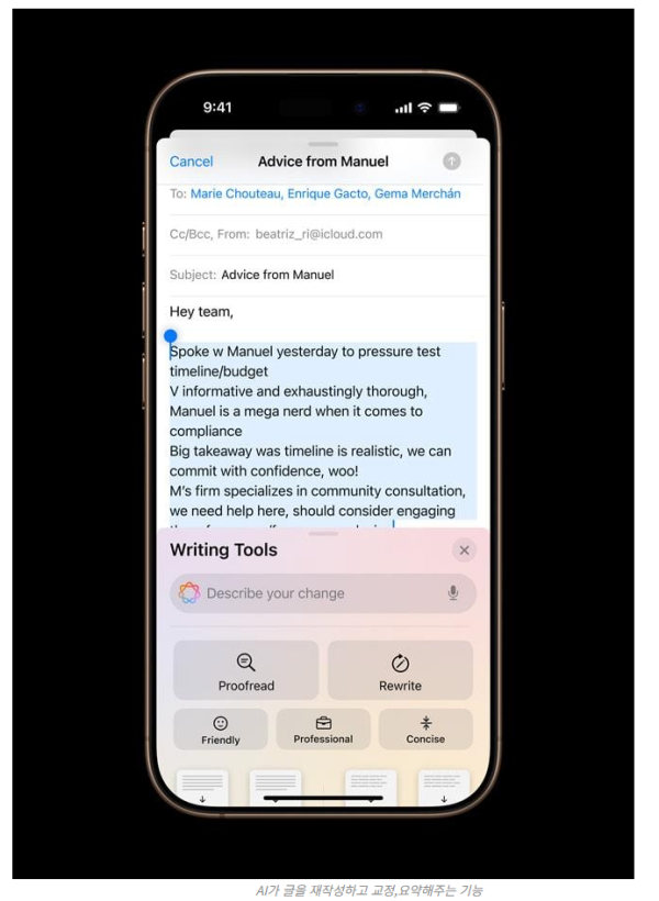 애플 인텔리전스는 이용자가 급하게 날려 쓴 메모를 AI가 다듬어 세련된 초대장으로 만들어주고, 원하는 이모티콘을 생성해주고 독창적인 이미지도 만들어 준다.