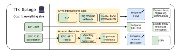 부테린은 ‘더 스플러지’의 핵심 목표로 EVM(이더리움 가상머신)을 안정적인 ‘최종 상태’로 만드는 것, 계정 추상화(account abstraction)를 프로토콜에 포함하는 것, 그리고 거래 수수료 경제를 최적화하는 것을 제시했다.