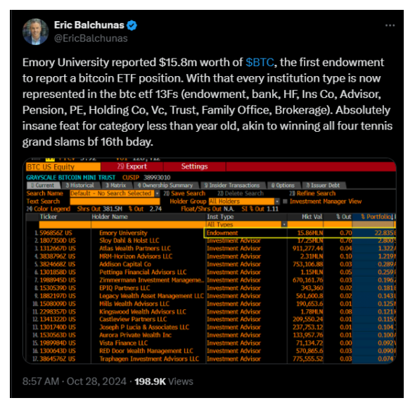 블룸버그 ETF 분석가 에릭 발추나스는 28일(현지 시간) 엑스(구 트위터)를 통해 에모리가 1580만 달러 상당의 비트코인 현물 ETF를 보유하고 있다고 밝혔다. 에모리가 보유한 비트코인 ETF는 ‘그레이스케일 미니 비트코인 트러스트(BTC)’다. 코인데스크에 따르면 에모리는 또 암호화폐 거래소 코인베이스 주식4312 주를 보유하고 있다고 미국 증권거래위원회(SEC)에 보고했다. 이는 약 92만2639 달러의 가치를 지닌다.