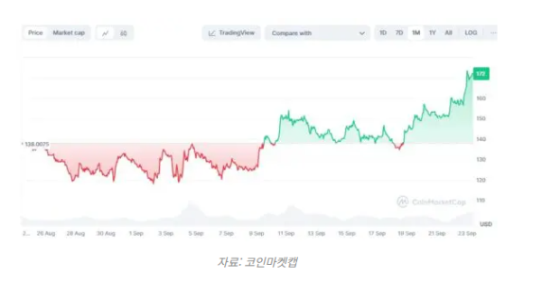코인마켓캡 데이터에 따르면, AAVE는 지난 1년간 172% 이상 상승했으며, 최근 일주일간 23% 이상의 상승폭을 기록했다.