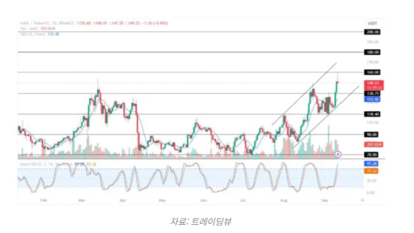 만약 상승세가 계속된다면, 에이브는 조만간 160달러의 저항선을 재시험할 가능성이 높다. 이 수준을 유지한다면 에이브는 이달 내 180달러의 상단 저항선까지 도달할 수 있다.