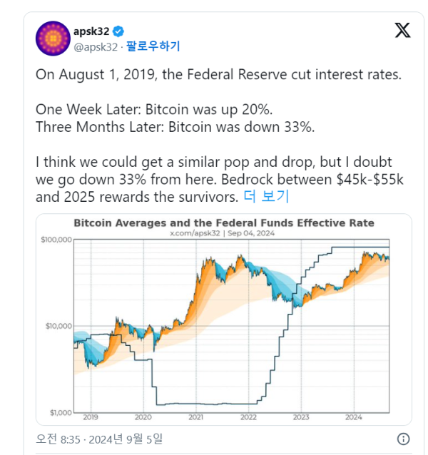 Apsk32는 “연준이 2019년 8월 금리 인하를 단행했을 때 비트코인 가격은 1주일 만에 약 20% 급등했다. 그러나 3개월 후 비트코인은 33% 이상 하락했다” 고 말했다. Apsk32는 올해 금리 인하가 동일한 영향을 미칠 것으로 내다봤다.