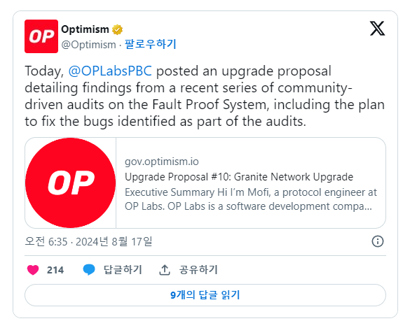 한편, 이번 보안 취약성과 관련해 OP Labs의 프로토콜 엔지니어인 모파이(Mofi)는 “감사에서 지적된 취약성들이 실제로 악용되지 않았으며, 사용자 자금은 안전하다”고 강조했다.