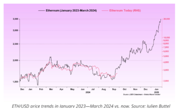 글로벌 매크로 인베스터의 매크로 리서치 책임자 줄리앙 비텔에 따르면, 이더리움의 1만 달러 목표에 대한 첫 번째 이유는 2023년 1월부터 2024년 3월까지의 이전 가격 프랙탈과의 유사성이다. 2023-2024년 프랙탈(검은색)은 ETH 가격이 1500달러와 2000달러 사이에서 통합한 후 3500달러로 돌파한 것을 보여준다. 현재 가격 움직임(빨간색 선)은 이 초기 통합 단계를 밀접하게 따른다.