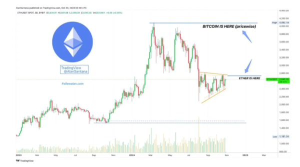암호화폐 분석가 앨런 산타나는 X를 통해 “비트코인 가격이 이더리움보다 과매수되어 있다”며 “이더리움이 비트코인보다 위험 대비 더 높은 수익의 기회를 제공한다”고 주장했다.