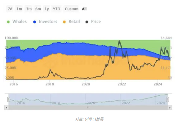 당시 소매 투자자들은 전체 이더리움 공급량의 약 56%를 보유하고 있었으나, 대규모 보유자의 비중이 커지면서 이들의 보유량은 점차 감소했다.