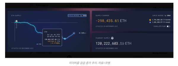 이더리움은 머지 이후 디플레이션 상태로 전환되어 2024년 4월까지 약 45만5,000 ETH가 감소했지만, 이후 공급이 약 15만 ETH 증가했다.