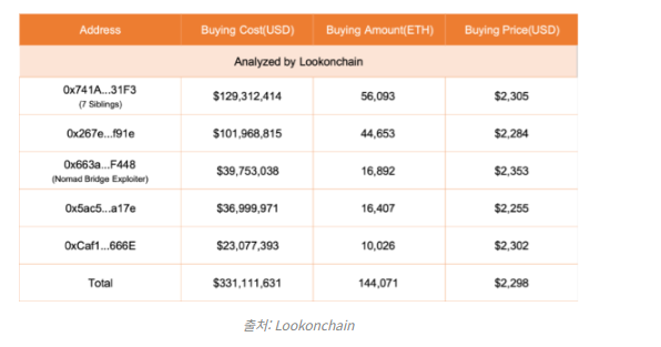 블록체인 추적업체 룩온체인(Lookonchain)에 따르면, “세븐 시블링스(7 Siblings)”로 알려진 한 대형 투자자가 2300 달러 부근에서 총 1억 2900만 달러 상당의 ETH를 매집했다.