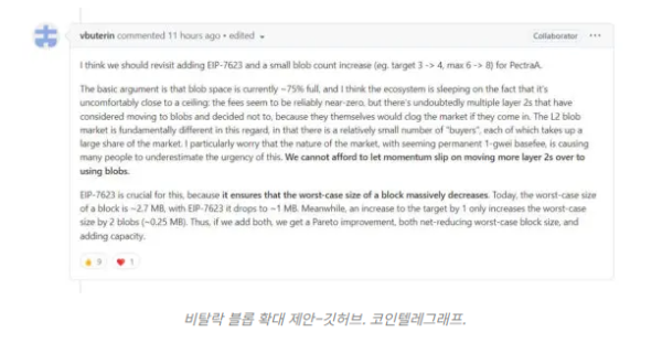 현재 이더리움 블록당 블롭 수는 최대 6개로 설정되어 있다. 부테린은 이를 8개로 늘려 이더리움 네트워크의 용량을 확대해야 레이어-2 네트워크가 더 많은 데이터를 저장할 수 있다고 강조했다.