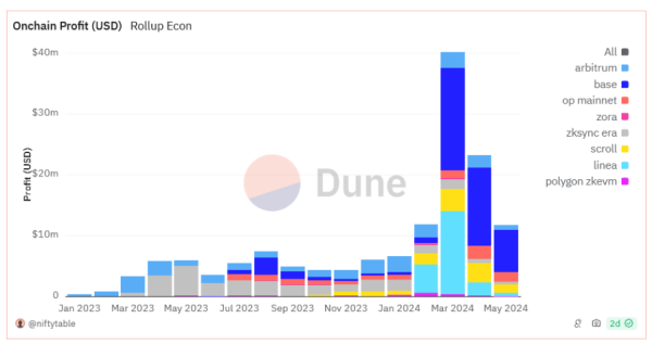 거래가 많아지니 수익도 급증했다. 듄 애널리틱스(Dune Analytics)에 따르면, 베이스는 밈 코인 열풍이 본격화한 3월에 1690만 달러라는 기록적인 수익을 올렸다. 이후 밈 열풍이 다소 주춤하면서 5월에는 수익이 58.6% 감소한 698만 달러를 기록했으나 2위를 기록한 OP의 157만 달러에 비해 월등히 높았다.