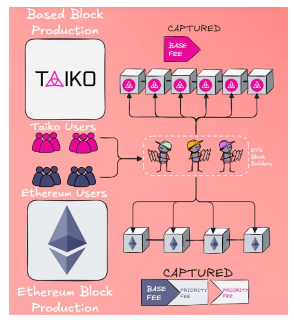 베이스드 롤업은 기존의 시퀀서 역할을 이더리움의 블록 빌더가 대신 수행하는 새로운 방식을 도입한다. 즉, 이더리움 블록 빌더들이 이더리움 트랜잭션뿐만 아니라 L2 트랜잭션도 처리하는 것이다. 이를 통해 이더리움은 L2에서 발생하는 우선 수수료 일부를 가져가게 되어 이더리움과 L2 간의 경제적 관계를 더욱 긴밀하게 만든다.