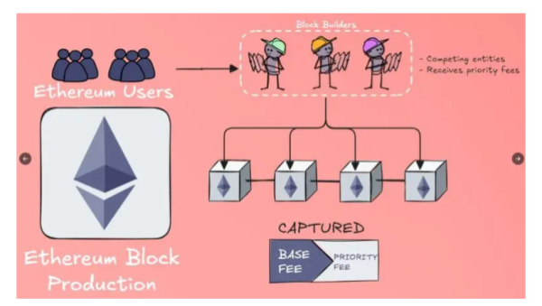 앞서 언급한 용어를 바탕으로 이더리움 블록 생성과 기존 롤업 방식에 대해 살펴보자. 이더리움에서 사용자의 트랜잭션(거래)은 블록 빌더(Block Builder)에 의해 수집되고, 해당 트랜잭션은 우선 수수료에 따라 정렬된다. 이후 검증자들은 블록을 형성해 이를 이더리움 네트워크에 포함시킨다. 이 과정에서 사용자 수수료 일부는 ‘기본 수수료’로 소각되고, 나머지 우선 수수료는 블록 빌더들이 가져간다.