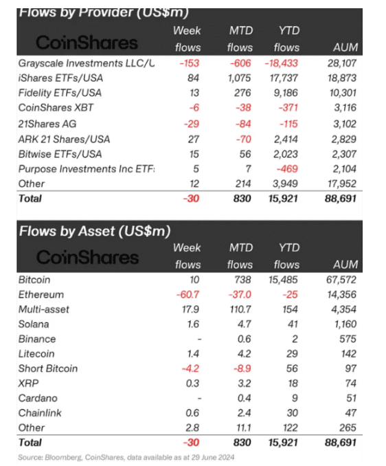 1일(현지 시간) 코인셰어스 주간 보고서에 따르면 6월 29일 기준으로 이전 한 주 동안 전체 암호화폐 펀드에서 3000만 달러가 순유출됐다. 이는 직전 2주간 순유출 규모와 비교해 대폭 축소된 것으로 디지털 자산 시장의 투자 분위기 안정을 시사한다.