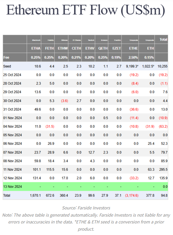 13일(현지 시간) 파사이드 인베스터스에 따르면 전일(현지 시간) 이더리움 ETF 전체적으로 1억3590만 달러가 순유입됐다. 이로써 9480만 달러의 누적 순유입을 기록했다. 이더리움 ETF가 지난 7월 출시 이후 누적 순유입을 기록한 것은 이번이 처음이다.