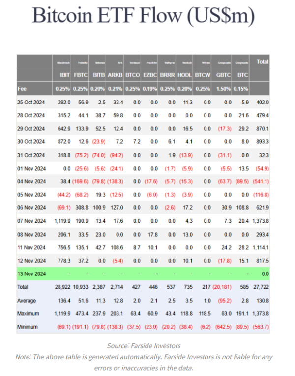 비트코인 현물 트러스트에는 전일 8억1750만 달러 순유입이 이뤄졌다. 블랙록 펀드(IBIT)에 7억7830만 달러, 피델리티 펀드(FBTC)에 3720만 달러 유입됐다. 그레이스케일 비트코인 트러스트(GBTC)와 아크 21셰어스 펀드(ARKB)에서 약간의 자금이 빠져나갔다