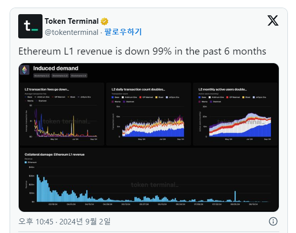 암호화폐 데이터 플랫폼 토큰터미널(Token Terminal)에 따르면 지난 6개월 동안 이더리움(ETH) 레이어1 수익이 99% 감소했다.