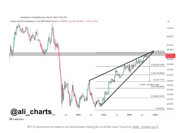상승 쐐기형에서는 자산 가격이 수렴하는 추세선 사이에서 좁아지며 상승한다. 차트에서 볼 수 있듯이, 비트코인의 시가총액 점유율은 상승 쐐기의 끝 부분에 가까워졌으며, 이는 하단 채널을 하향 돌파할 가능성을 시사한다.