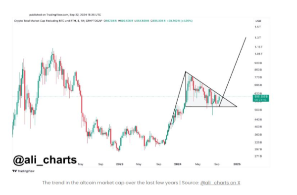 뉴스BTC에 따르면 암호화폐 분석가 알리 마르티네즈는 최근 X에 게시된 두 개의 게시물에서 알트코인 시즌을 예고할 수 있는 몇 가지 신호를 논의했다. 마르티네즈가 공유한 첫 번째 차트는 비트코인과 이더리움을 제외한 모든 암호화폐의 시장 합산 시가총액을 보여준다.