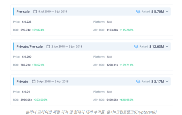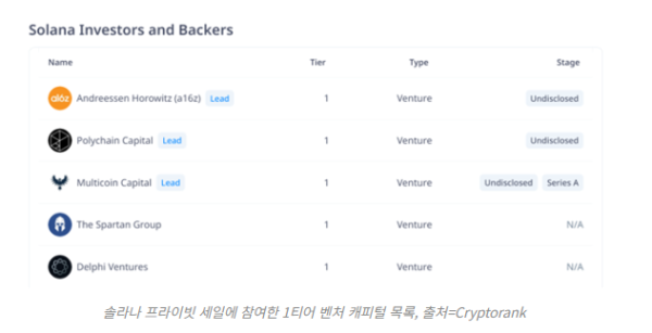 [블록미디어 박현재]크립토랭크(Cryptorank)라는 사이트에 가면 유명 프로젝트들의 초기 투자에 성공할 경우 얼마나 높은 소위 “꿈의 수익률”을 이룰 수 있는지 알 수 있다. 솔라나의 경우 첫번째 프라이빗 세일 시작가는 0.04$로 현 시세 154$ 기준으로 약 6500배의 수익률을 달성할 수 있는 가격이다. 이 라운드에는 안드레센 호로위츠(Andreessen Horowitz)나 폴리체인(Polychain)과 같이 현 1티어 벤쳐 캐피털들이 리드하여 이루어졌다. 리드 VC들이 1티어가 될 수 있었던 것도 솔라나 투자에 성공적으로 참여했기 때문이다.