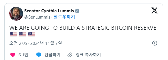 그녀는 트럼프의 당선이 확실시 되자 트럼프의 비트코인 공약을 실천하겠다는 입장을 엑스에 공개했다.