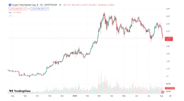 코인텔레그래프에 따르면 암호화폐 시장은 8월 2일 이후 3일간 3130억의 시가총액이 증발했다. 이는 2023년 8월 중순 이후 가장 큰 감소다.