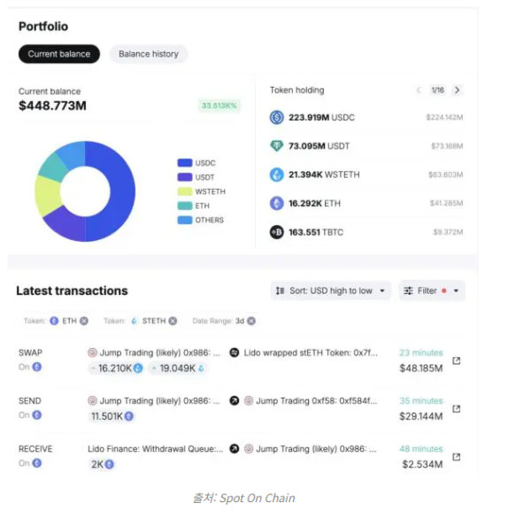스팟 온 체인은 이날 X(구 트위터)를 통해 “1만1500 ETH가 자주 거래소 입금을 위해 사용되는 ‘0xf58’ 지갑으로 이전되었다”고 밝혔다. “현재 점프 트레이딩은 2만1394 WSTETH(약 6360만 달러)와 1만6292 ETH(약 4130만 달러)를 보유하고 있으며, 1만9049 STETH는 리도에서 언스테이킹 과정 중이다”라고 덧붙였다.