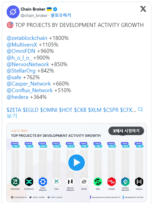 한편 7월 17일 체인프로커(ChainBroker)에 조사에 따르면, 제타체인은 주간 개발 활동 데이터 상승률 1위를 기록했다. 상승률은 1800%에 달한다.