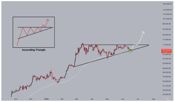 독립 분석가 젤레(Jelle)는 BTC 가격이 상승 쐐기형의 상승 추세선에 도달했다고 설명하며, 100일 지수 이동 평균(EMA)과 상승 삼각형의 하단을 지목했다. 젤레는 현 수준에서 비트코인이 반등에 성공한다면 그 다음 목표는 7만 2000달러라고 덧붙였다.