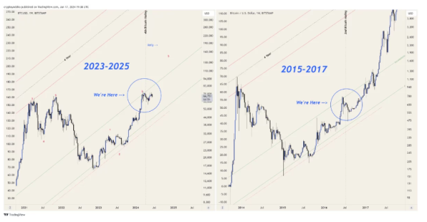 익명의 분석가 요다(Yoddha)는 비트코인의 현재 조정이 2015-2017 주기와 유사하다고 언급했다. 그는 “2차 BTC 반감기 당시에도 비슷한 조정이 있었다”며, 이후 2017년에 대규모 강세장이 나타났다고 설명했다.