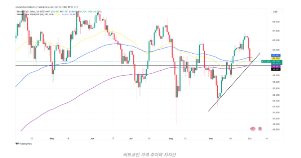 비트코인은 9월 29일부터 10월 3일까지 6000 달러 하락해 일시적으로 2주 만에 최저치인 5만9860 달러까지 떨어졌다. 중동 지역의 지정학적 긴장이 매도세를 촉발한 것.