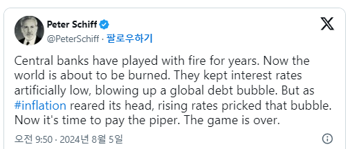 피터 쉬프는 “중앙은행들은 금리를 인위적으로 낮게 유지하여 글로벌 부채 거품을 만들었다. 그러나 인플레이션이 고개를 들자 금리 상승이 거품을 찔렀다”고 주장했다.