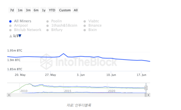 인투더블록의 데이터에 따르면, 채굴자 비트코인 보유량은 최근 190만 BTC으로 감소했다. 이는 2010년 3월 이후 가장 낮은 수준이다.