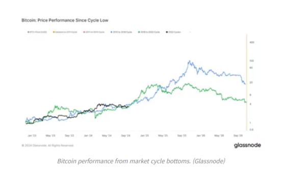 비트코인은 2022년 11월 시장 최저점 이후 290% 상승했으며, 이전 두 차례의 상승 주기와 비슷한 흐름을 보이고 있다. 글래스노드에 따르면, 비트코인은 2015-2018년과 2018-2022년 사이 각각 309%와 251% 상승했다.