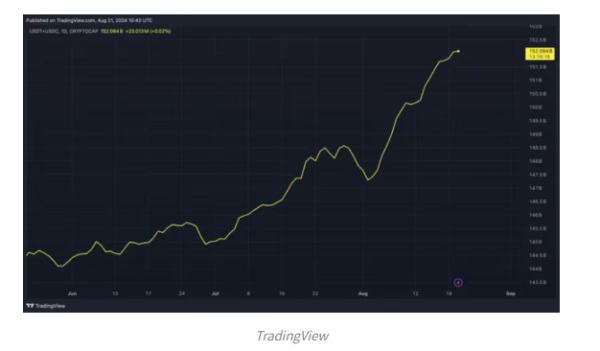21일(현지 시간) 코인데스크는 트레이딩뷰 차트를 인용, 테더와 USDC의 시가총액 합계가 이달에 거의 3% 증가, 사상 최고인 1520억 달러에 도달했다고 보도했다.