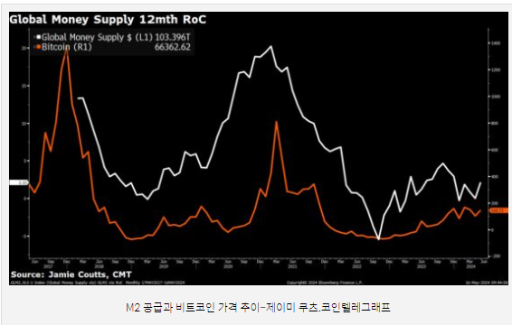 M2 공급은 미국 내 현금과 단기 은행 예금을 포함한다. 공급 증가가 이전의 비트코인 상승장과 연관되어 왔다. 리얼 비전의 수석 암호화폐 분석가인 제이미 쿠츠는 5월 16일 엑스(트위터)에서 “이는 BTC 상승 사이클과 높은 상관 관계가 있기 때문이다. 내가 추적하는 세 가지 주요 요소 중, 글로벌 M2는 비트코인 움직임을 가장 많이 포착하는 것으로 보인다”라고 말했다.
