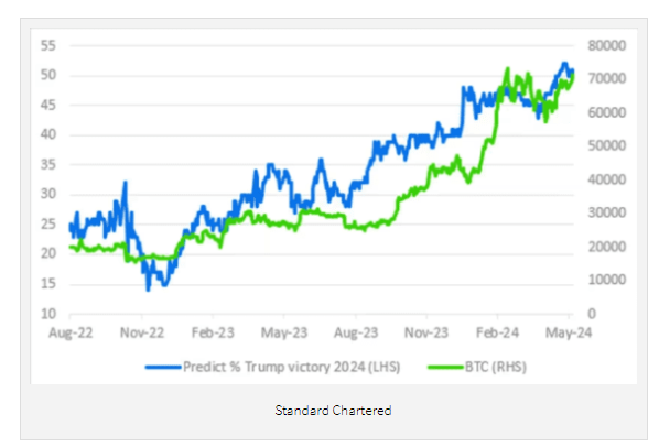 코인데스크는 6일(현지 시간) 스탠다드 차타드가 작성한 4월 22일 ~ 5월 24일 비트코인 가격과 트럼프의 승리 가능성 간 상관관계를 보여주는 차트를 소개했다. 차트는 이 기간 트럼프의 당선 가능성이 높아지는 가운데 비트코인 가격도 상승 추세를 나타냈음을 보여준다.