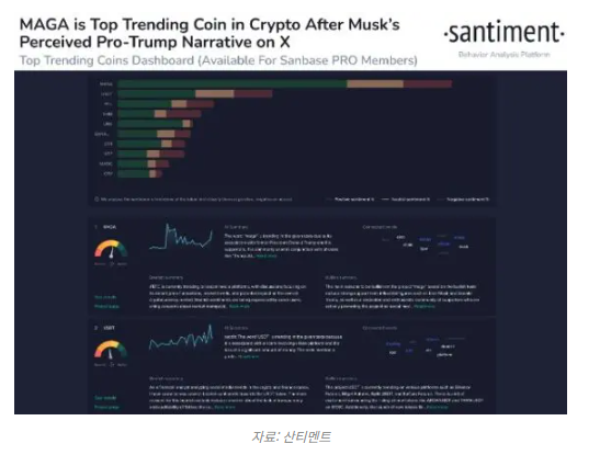 암호화폐 분석업체 산티멘트는 일론 머스크 테슬라 CEO가 공화당 후보 도널드 트럼프 전 대통령을 공개 지지한 후 트럼프(MAGA) 코인이 소셜미디어에서 가장 주목받는 종목이 됐다고 밝혔다.