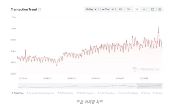 TRON의 10월 거래량은 전월 대비 8.15% 증가하며 사용자 관심이 높아진 가운데, 일일 거래가 10월 24일 기준 1040만 건에 달했다. 이는 연중 최고 수치이며, 전체 최고 기록인 1300만 건을 향해 접근하고 있다. 2024년 내내 일일 거래량은 지속적으로 증가해 총 84억 달러의 일일 자산 이동량을 기록했다.