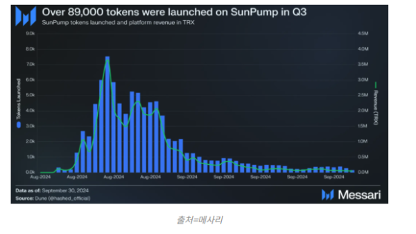 보고서는 “밈코인 런치패드 선펌프(SunPump)에서 지난 8월부터 두 달  약 8만9000개 이상의 토큰이 발행됐다”며 “트론의 탈중앙화금융(DeFi·디파이) 거래가 3분기 487% 증가했다.