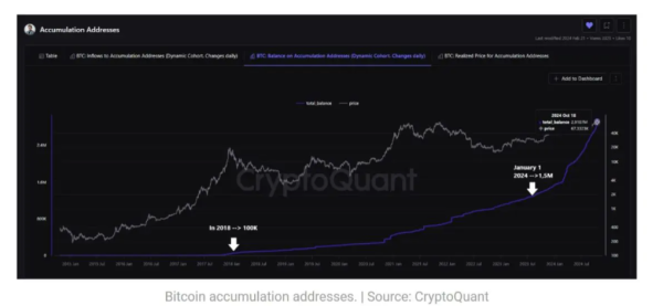 보고서에 따르면 2024년 1월 기준으로 이들 주소들은 150만 BTC를 보유하고 있었다. 그러나 10개월 만에 그 수치는 거의 두 배로 증가해 290만 BTC에 도달했다. 이러한 누적 행동은 새로운 것은 아니지만, 2024년은 그 속도와 규모 면에서 특별하다.