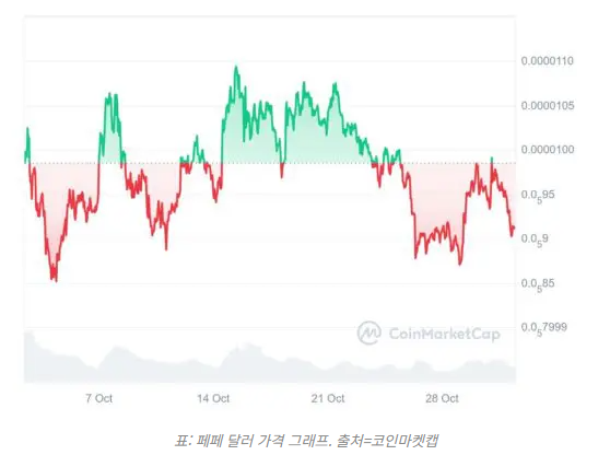 한편 페페코인의 최근 시장 성과는 저조했다. 가상자산(암호화폐) 중계 플랫폼 코인마켓캡 데이터에 따르면 1일 오전 10시15분 기준 페페코인은 지난 하루 동안 5.12%, 일주일 동안 7.46% 하락한 0.059달러로 거래되고 있다.