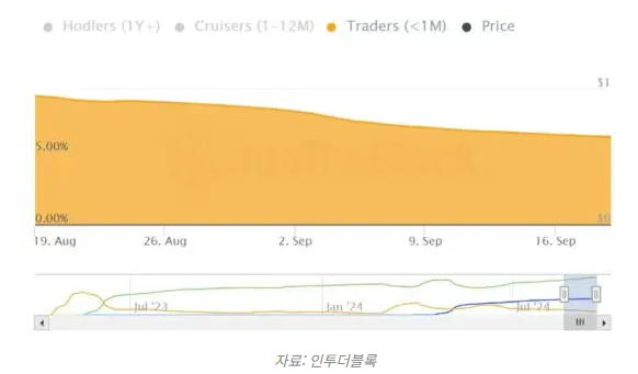 만약 페페가 현재의 다지기 구간에서 벗어나면 단기적인 이익 실현이 예상된다. 또한, 단기 보유자들이 가격에 미치는 영향이 줄어들면서, 이들의 매도세가 페페 가격에 의미 있는 영향을 미치지 않을 것으로 보인다.