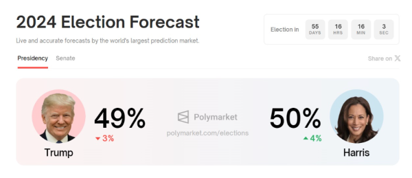 11일(현지 시간) 폴리마켓 대선 베팅에서 해리스는 50%, 트럼프는 49%를 기록 중이다.
